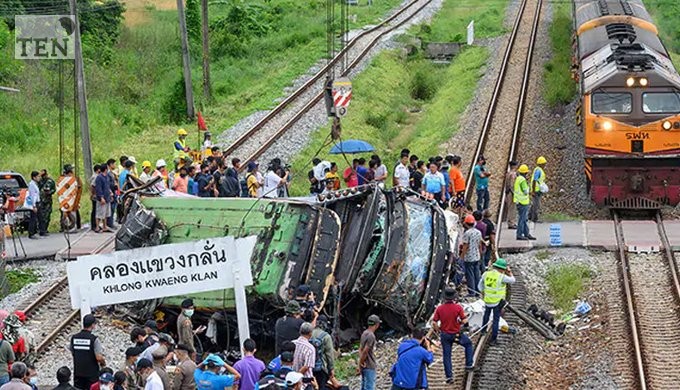 அப்போது பாங்காக்கிலிருந்து 50 தொலைவில் உள்ள ரயில்வே கிராஸிங் பகுதியில் பேருந்து சென்றபோது அங்கு வந்த சரக்கு ரயில் ஒன்று பேருந்து மீது வேகமாக மோதியது.