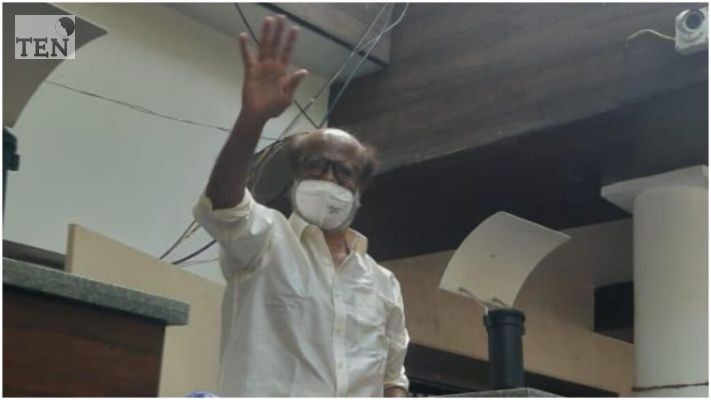 இதையடுத்து முகக்கவசம் அணிந்தவாறு வீட்டின் சுற்றுசுவருக்குள் நாற்காலி போடப்பட்டு அதில் ஏறி நின்று ரசிகர்களை நோக்கி கையசைத்தார் ரஜினி.