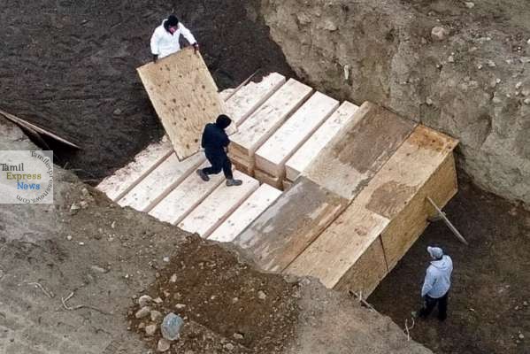 கொரோனா உயிரிழப்பு – அமெரிக்காவில் பெரிய பள்ளம் தோண்டி புதைக்கப்படும் உடல்கள்