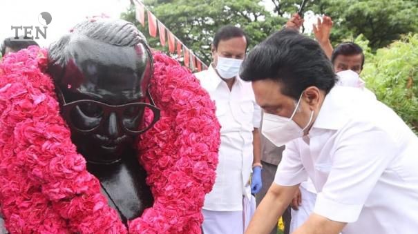 அண்ணாவின் 112-வது பிறந்த நாளை முன்னிட்டு வள்ளுவர் கோட்டத்தில் உள்ள அண்ணாவின் சிலைக்குத் திமுக தலைவர் மு.க.ஸ்டாலின் மரியாதை செலுத்தினார்.
