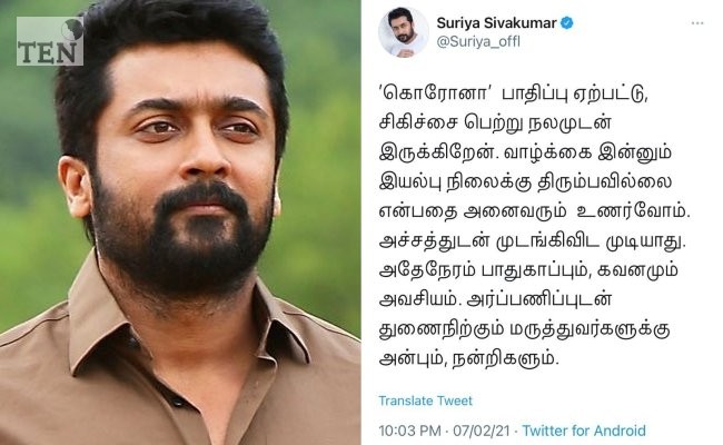 இதுதொடர்பாக நடிகர் சூர்யா தனது ட்விட்டர் பக்கத்தில், “கொரோனா பாதிப்பு ஏற்பட்டு, சிகிச்சை பெற்று நலமுடன் இருக்கிறேன்.
