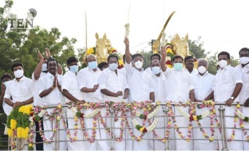 இந்த நிகழ்வில் அமைச்சர்கள் செல்லூர் ராஜூ, சி. விஜயபாஸ்கர், ஆர்.பி.உதயகுமார் உள்ளிட்டோர் பங்கேற்றனர். முன்னதாக இருவரும் சிலைக்கு அருகில் வைக்கப்பட்டுள்ள திருவுருவப் படத்துக்கும் மலர் தூவி மரியாதை செலுதினார்கள்.