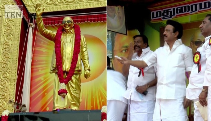 மதுரை சிம்மக்கலில் மறைந்த முன்னாள் முதலமைச்சர் கலைஞர் கருணாநிதியின் முழு உருவ வெண்கல சிலையை திமுக தலைவர் மு.க.ஸ்டாலின் திறந்து வைத்தார்.