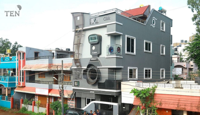 மேலும் மூன்று அடுக்குகளை கொண்ட இந்த வீடு, DSLR கேமராவுக்கான அனைத்து அம்சங்களையும் கொண்டு வடிவமைக்கப்பட்டுள்ளது. லென்ஸ், ஃபிளாஷ், படச்சுருள் வடிவங்கள் இந்த வீட்டின் முகப்பில் இடம்பெற்றுள்ளன.