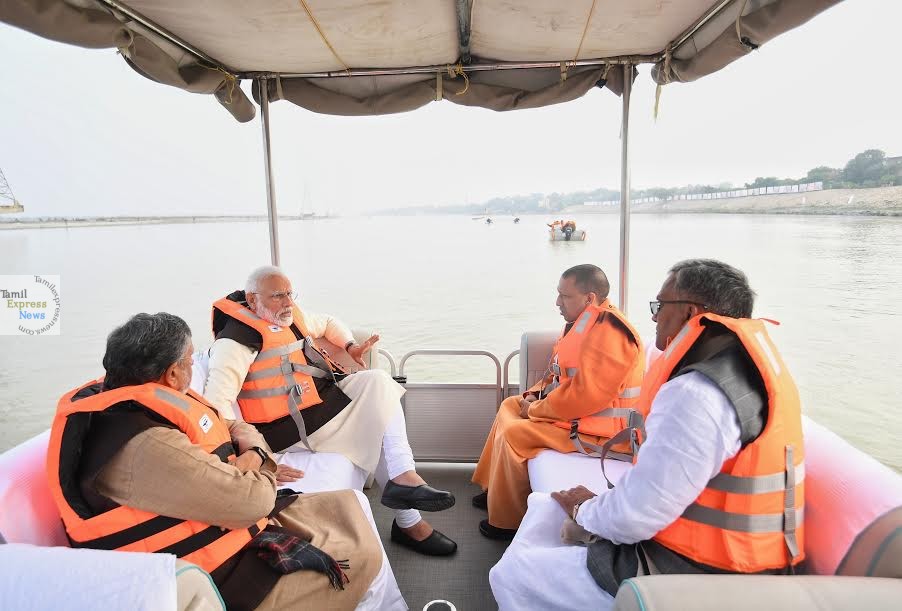 பின்னர், பிரதமர் மோடி உள்ளிட்டோர் கங்கை நதியில் படகில் பயணம் செய்து ஆய்வு மேற்கொண்டனர்.