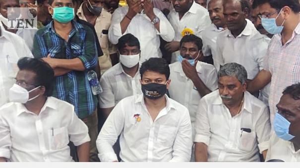 அவருடன் ஐம்பதுக்கும் மேற்பட்ட வாகனங்களும், ஆயிரக்கணக்கான தொண்டர்களும் திரண்டு வந்தனர். இதனால் விதிமுறைகளை மீறி அதிகக் கூட்டம் சேர்த்திருப்பதால் உதயநிதியைக் கைது செய்ய போலீஸார் ஆயத்தமானார்கள்.